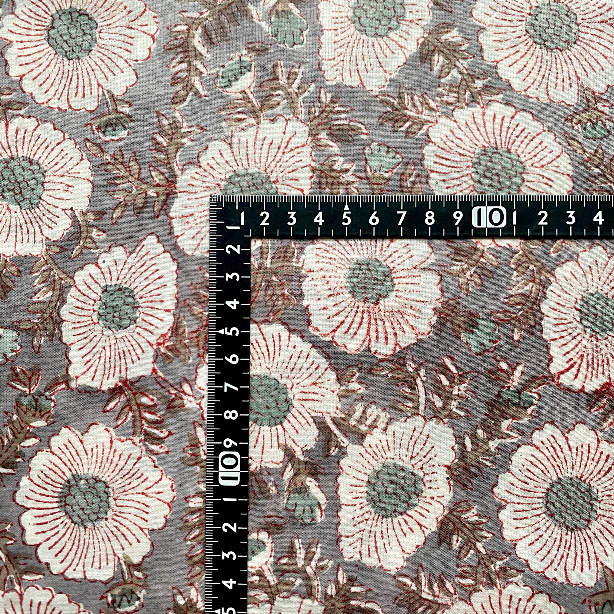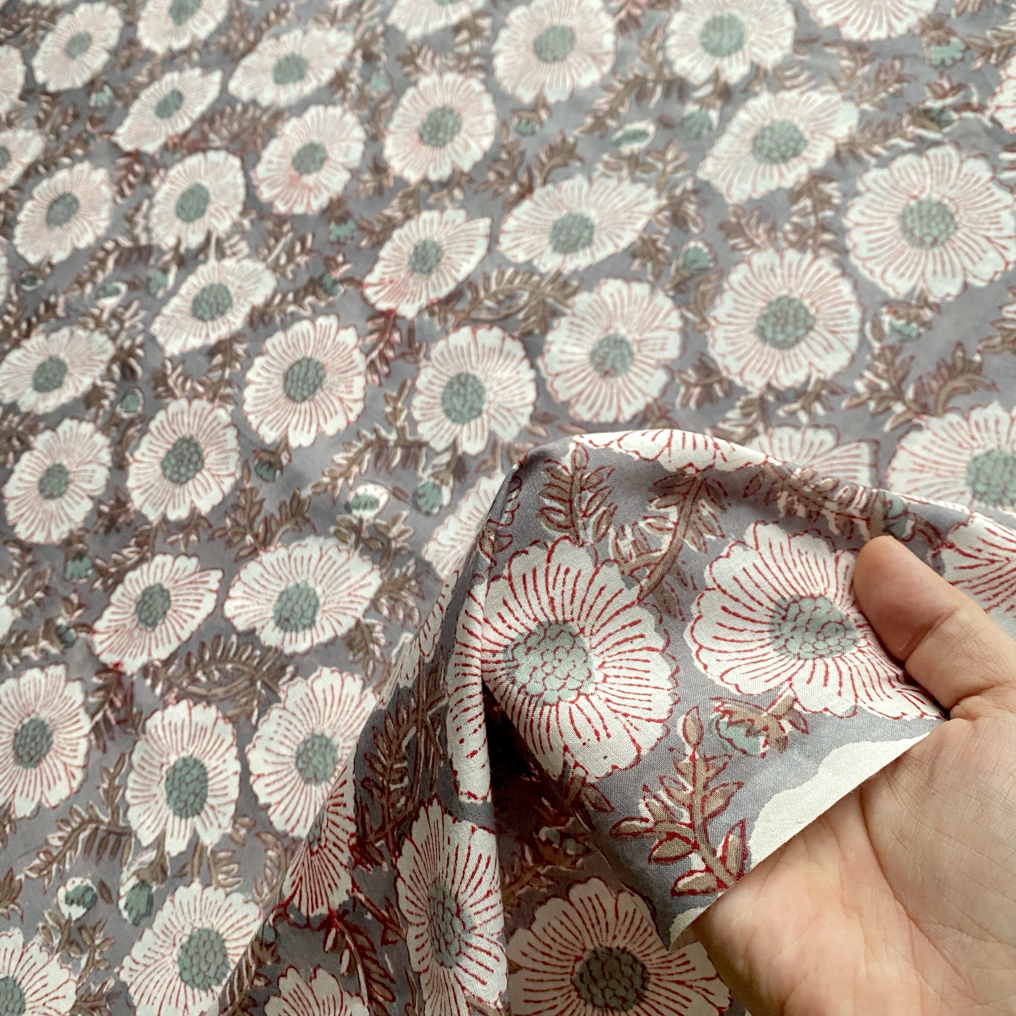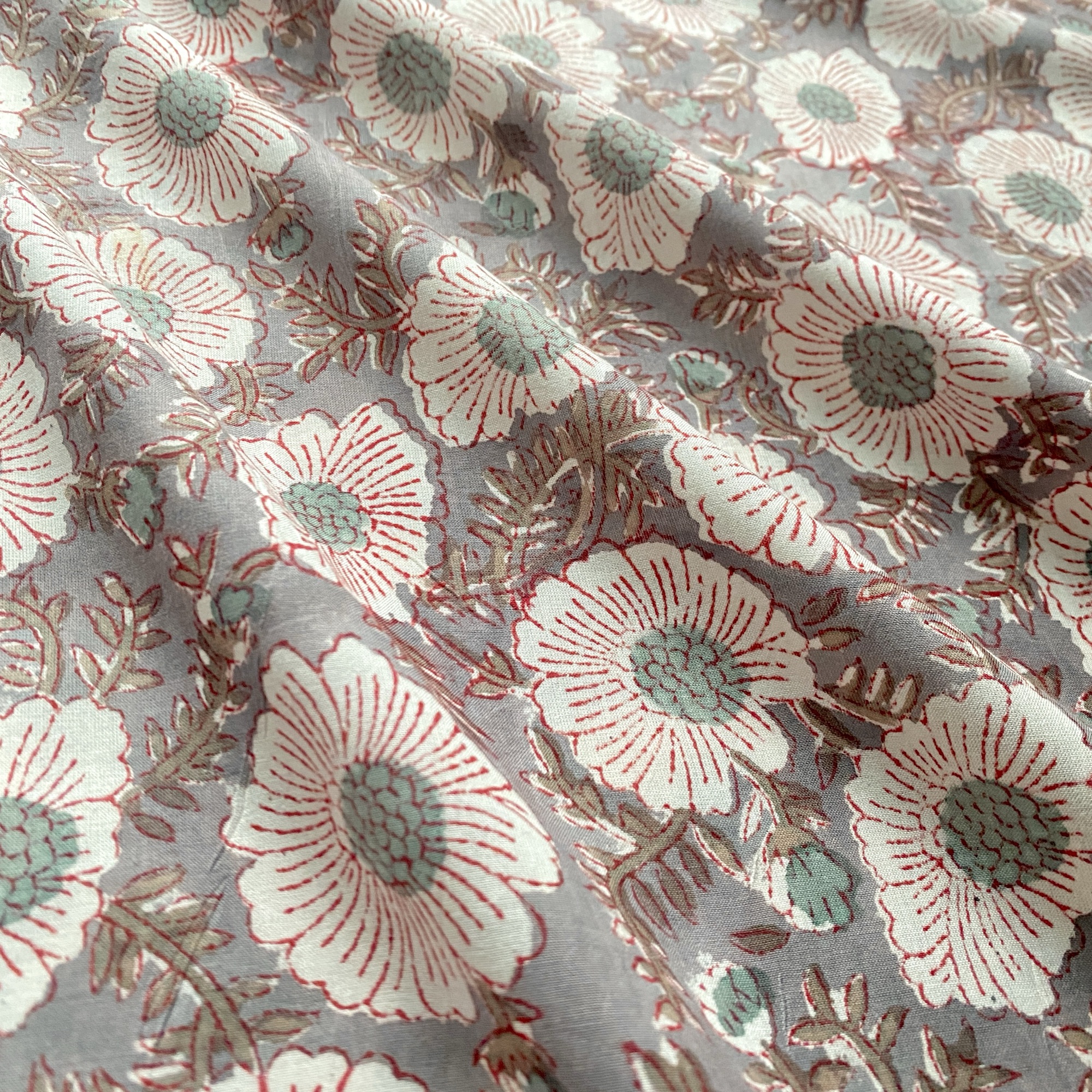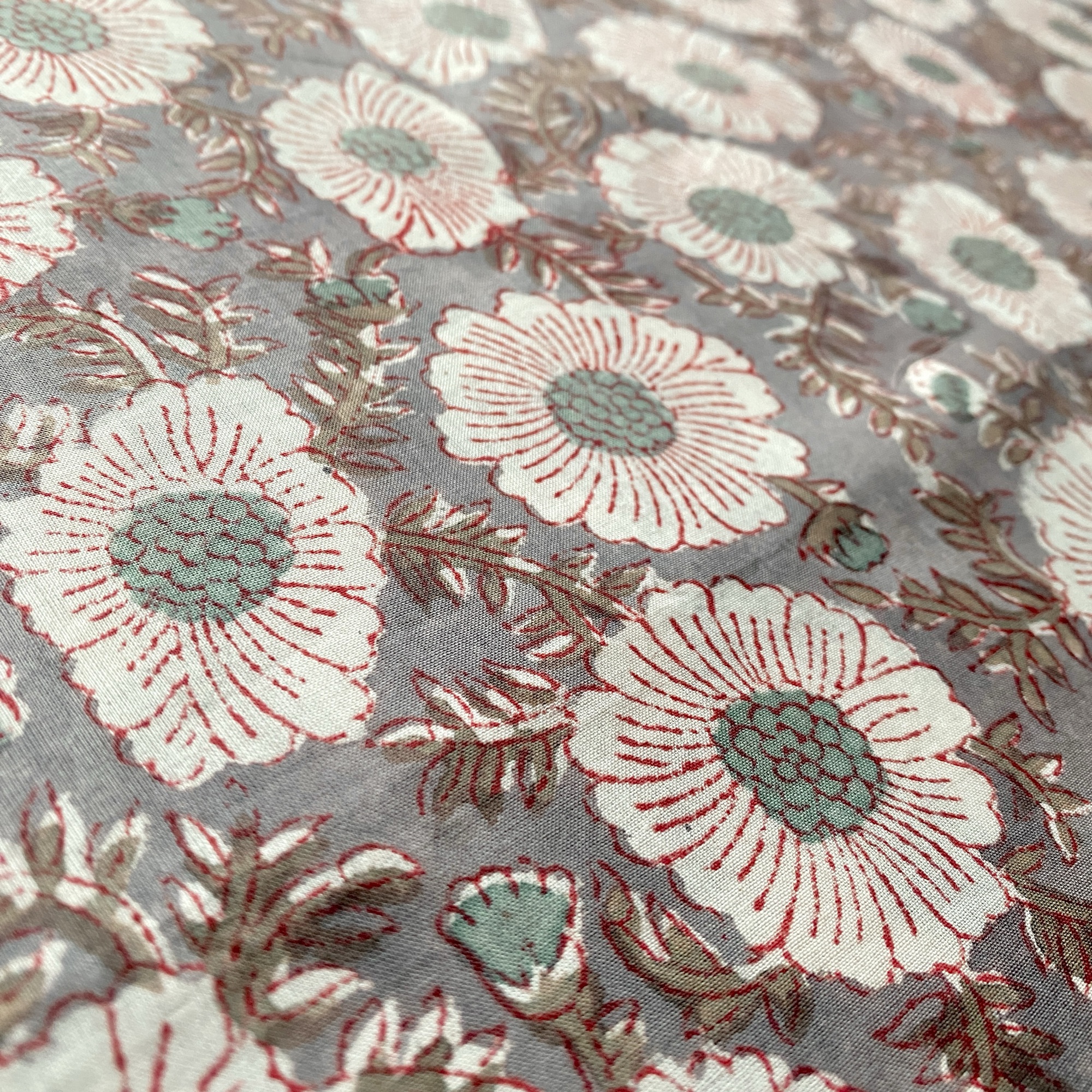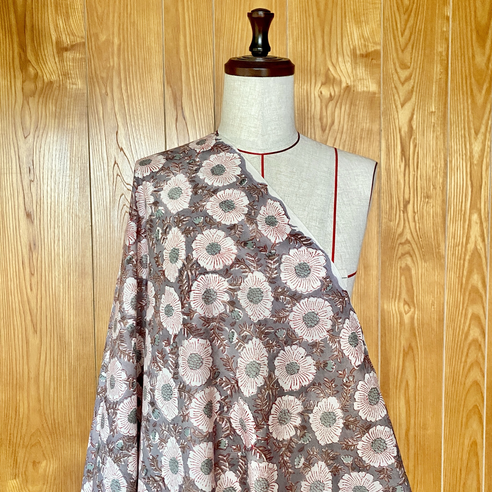 グレーのベースに、白の花がふんわりと浮かぶブロックプリント生地。繊細な赤いラインと、やさしいペールブルーの花芯がアクセントになり、落ち着きのあるシックな雰囲気の中にも、どこかあたたかい可憐さを感じさせます。
