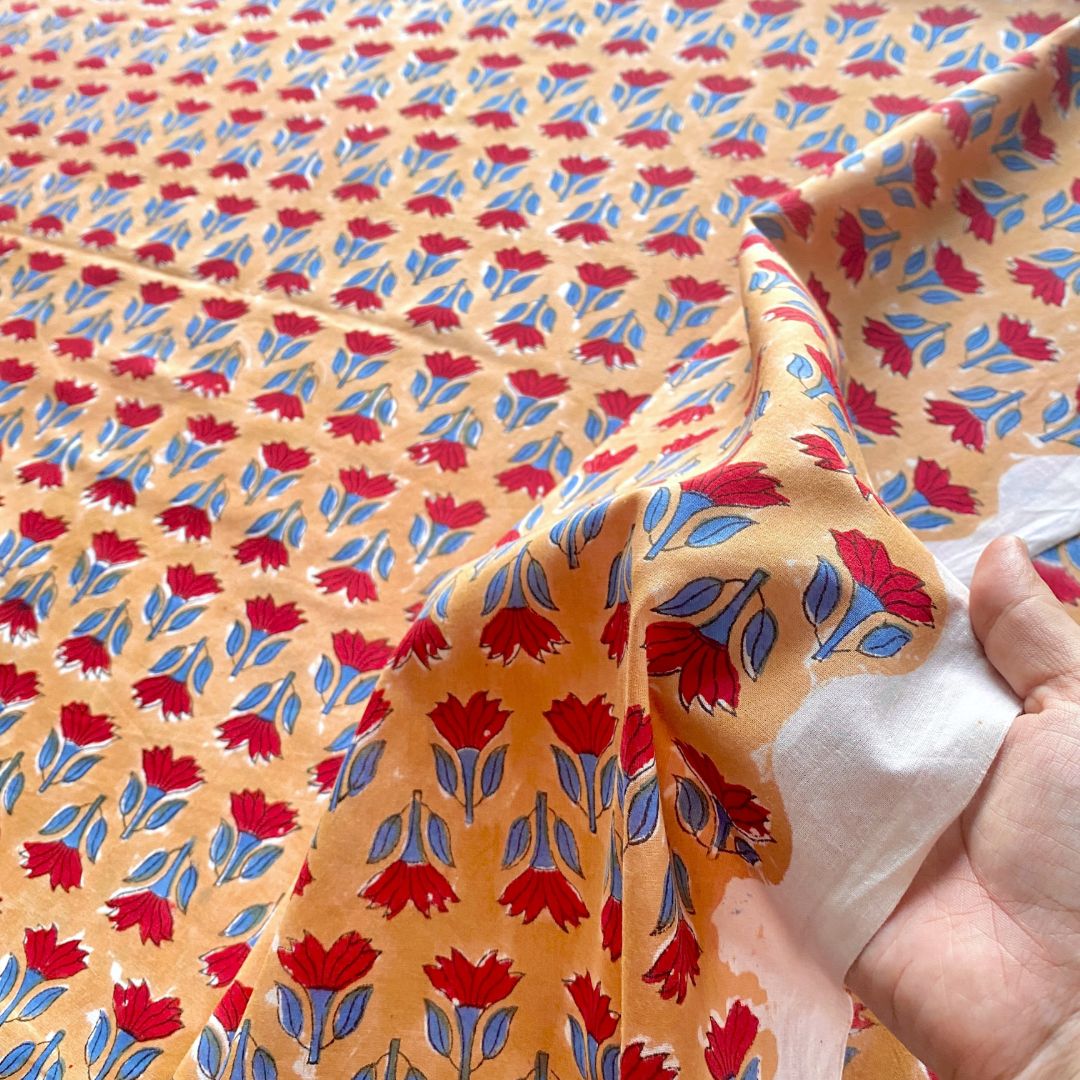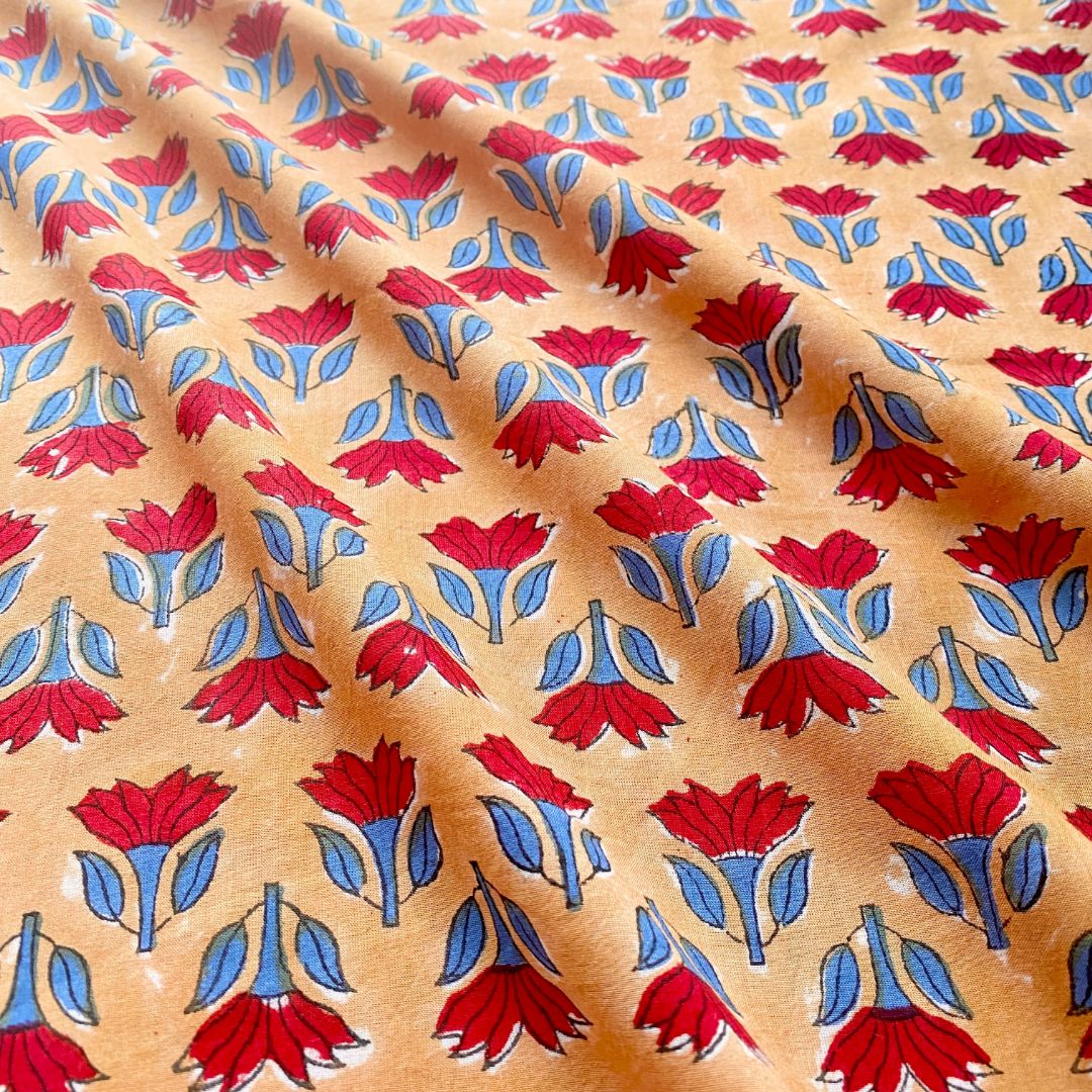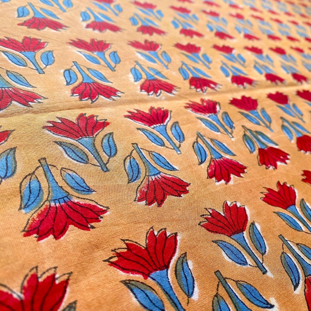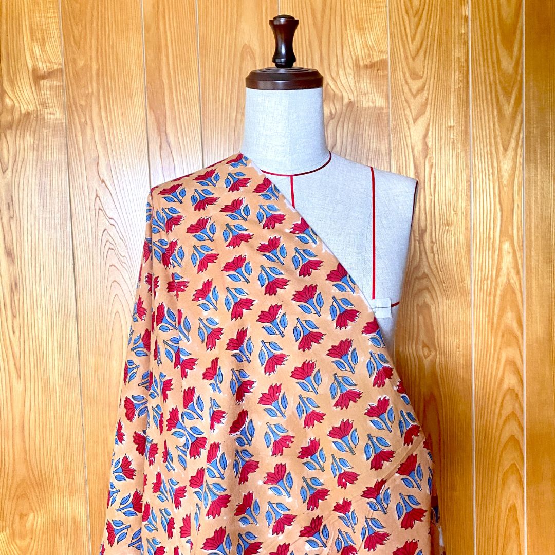 淡いキャメルブラウンをベースに、鮮やかな赤い花と青みを帯びたリーフが映えるブロックプリント生地。土っぽさの中に華やぎがあり、ボヘミアンテイストを存分に楽しめるデザイン。