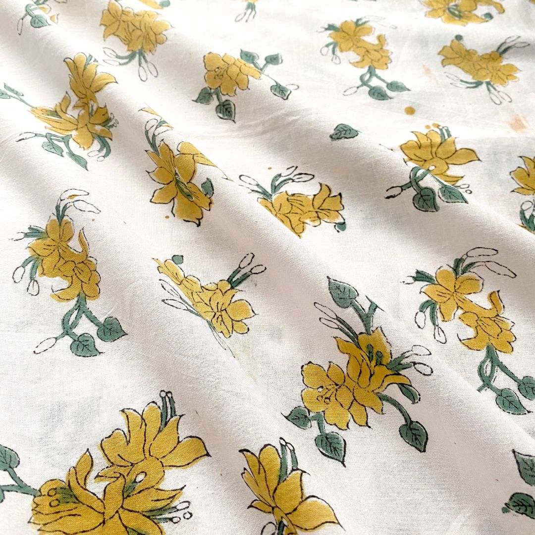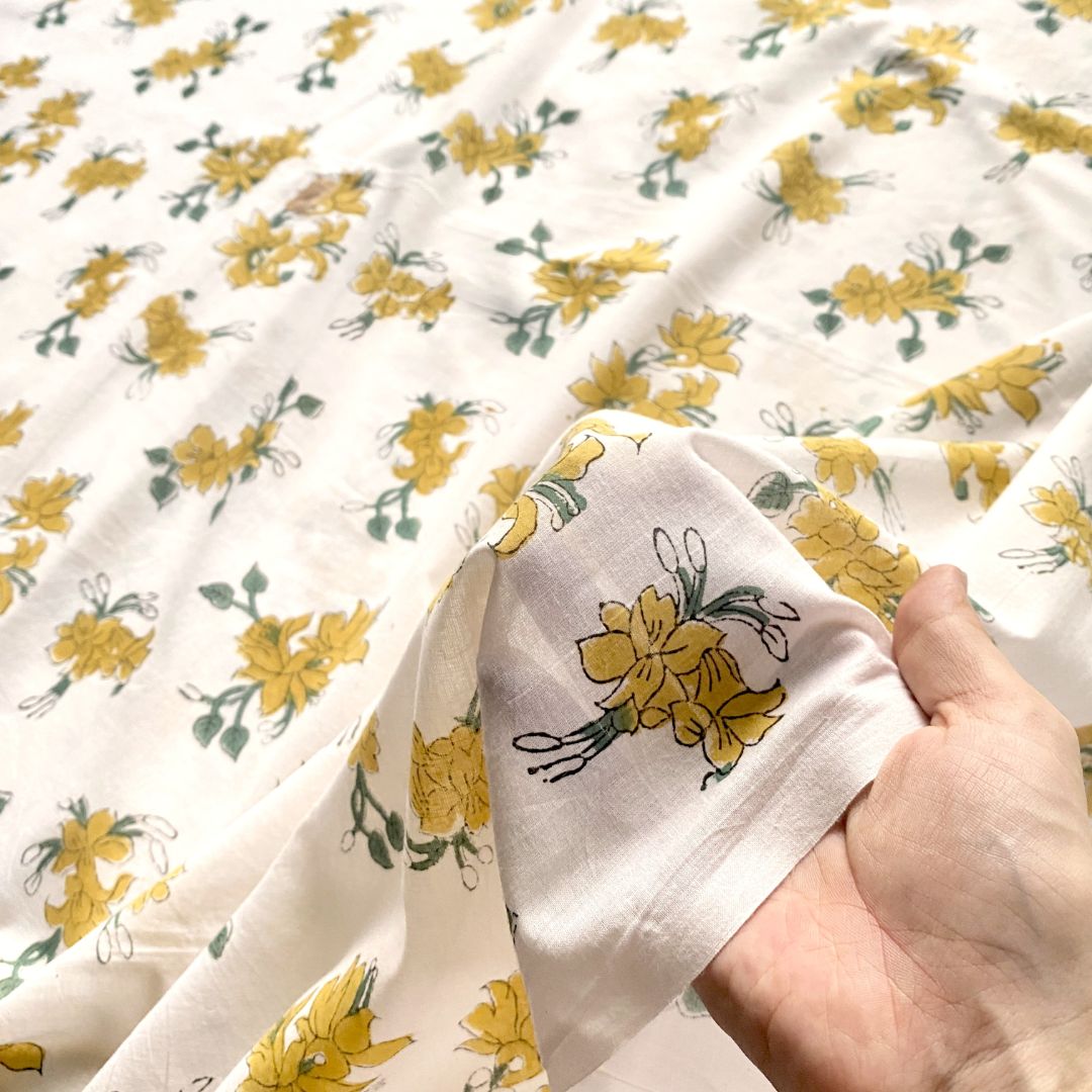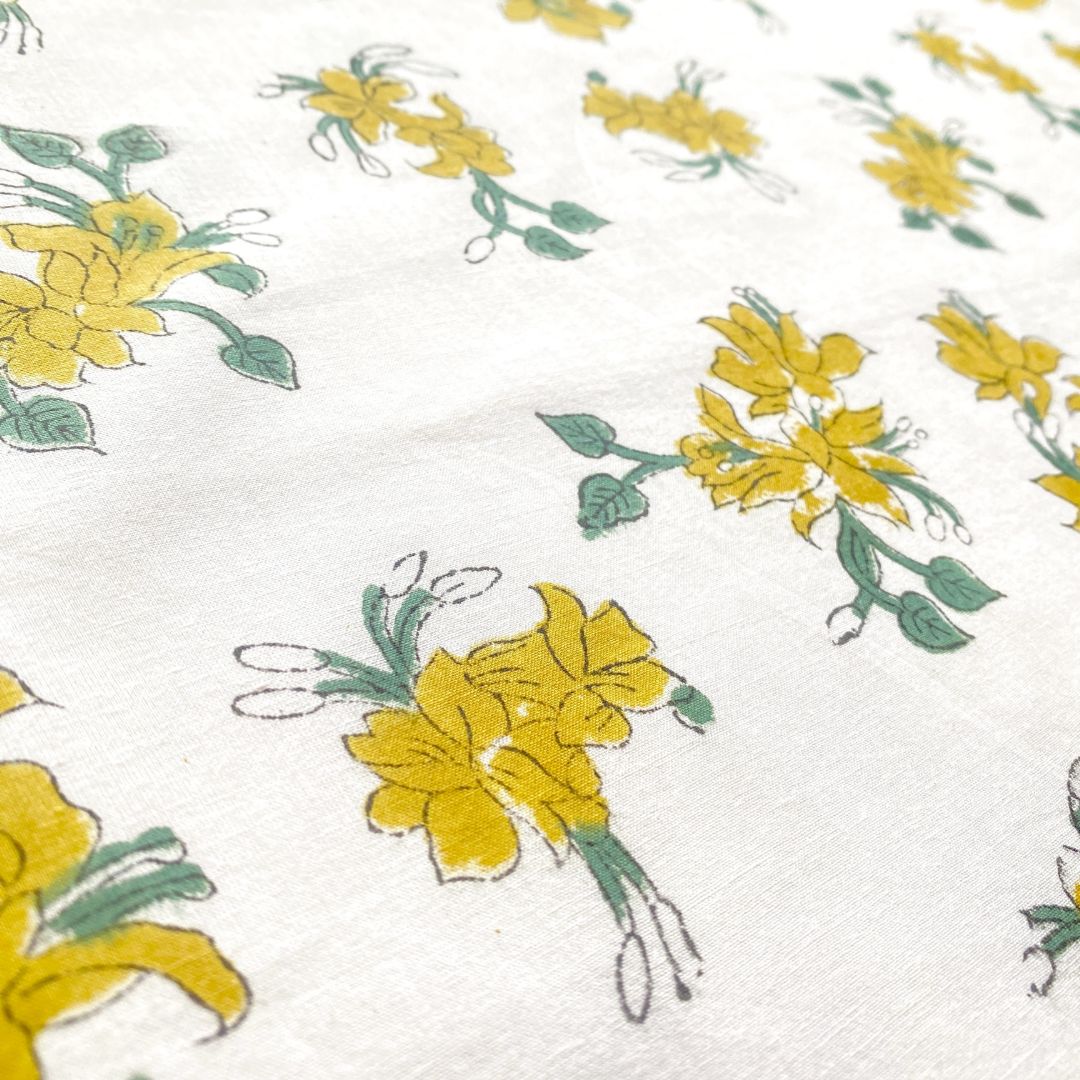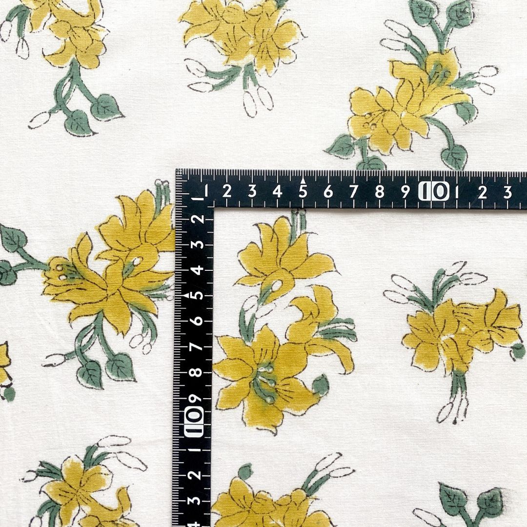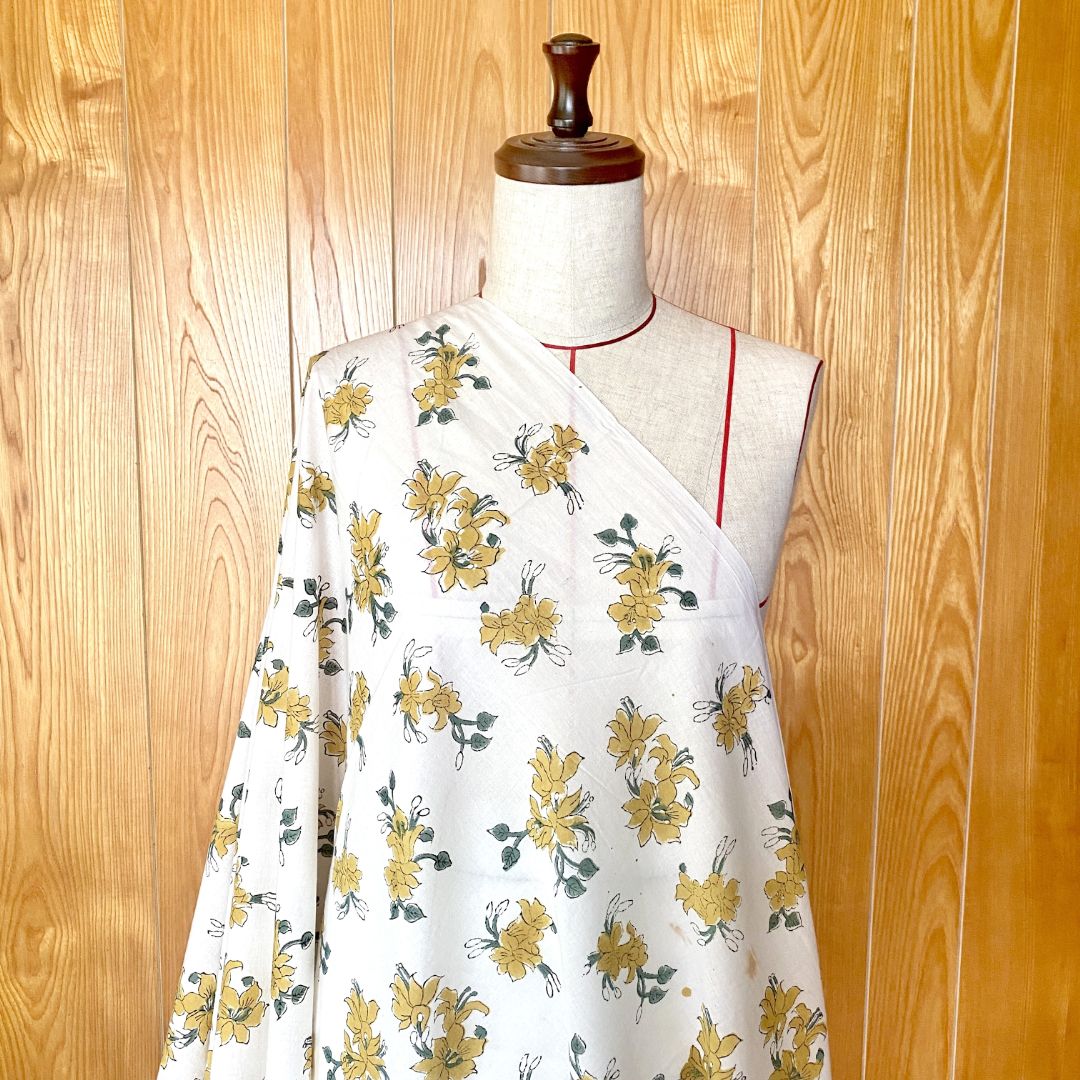 まるで陽だまりの中に散りばめられた花々のよう。白地にぱっと咲いたイエローのお花が、軽やかで爽やかな印象を与えてくれるブロックプリント生地。素朴でナチュラルなのに、どこかクラシックな品の良さも漂う柄です。さわやかさと華やかさを両立した1枚。