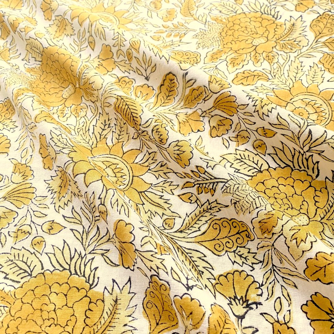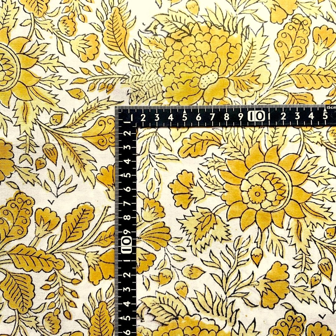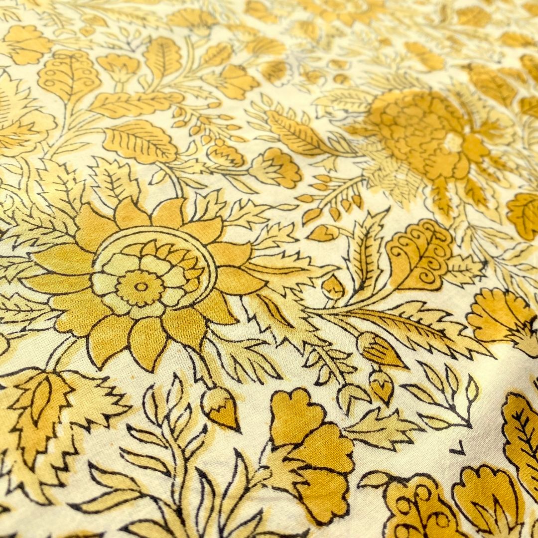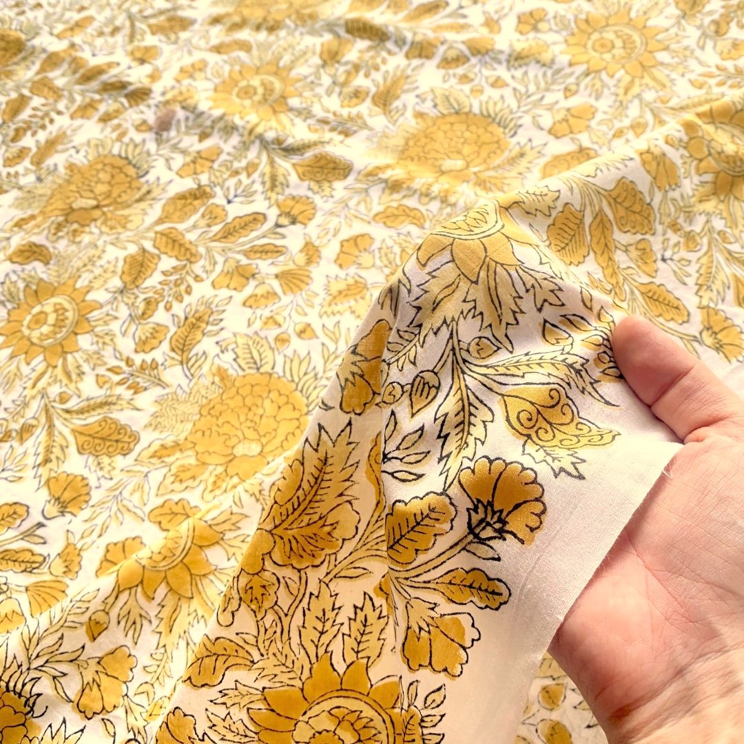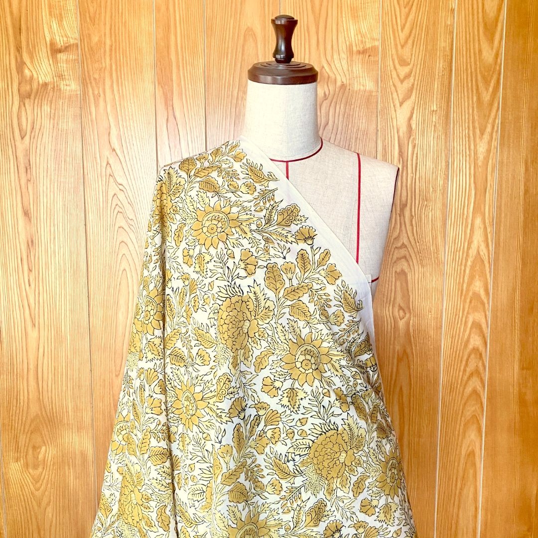 白地に黄金色の花々が大胆に描かれた、存在感のあるブロックプリント生地。アンティーク感漂う色合いは一見落ち着いて見えるけれど、着こなし次第で驚くほど渋くてカッコいい印象に。