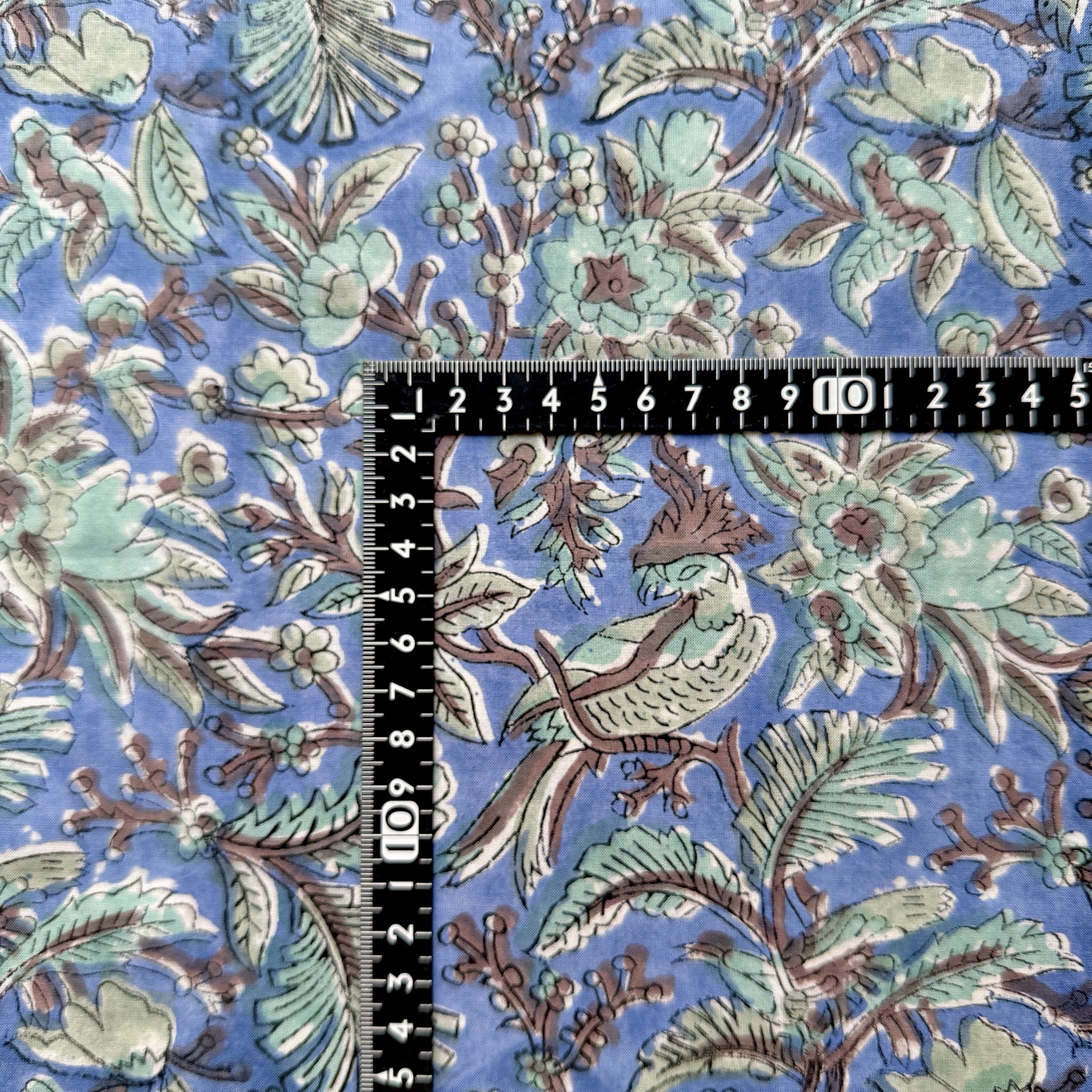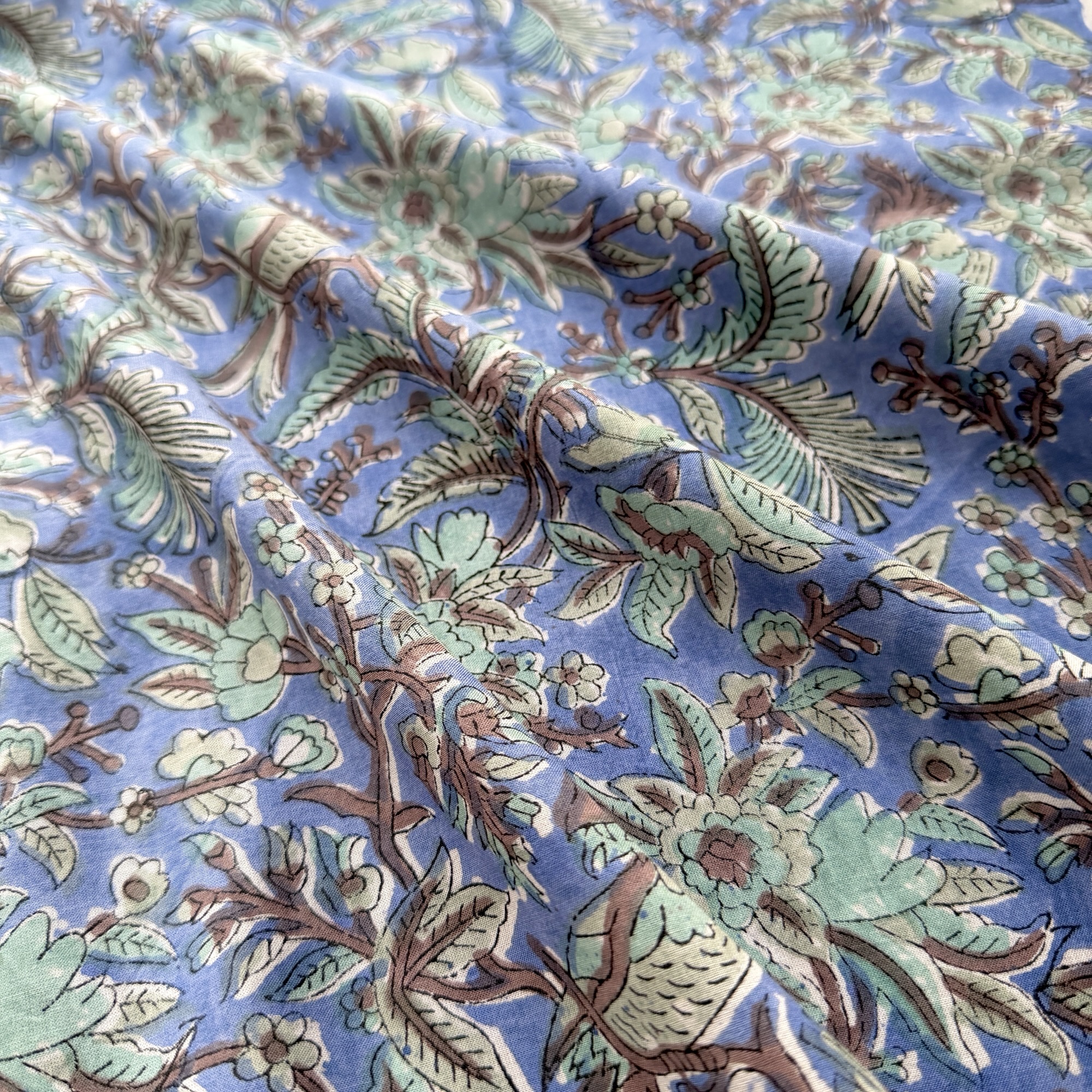 落ち着いたブルーの背景に広がる植物模様。