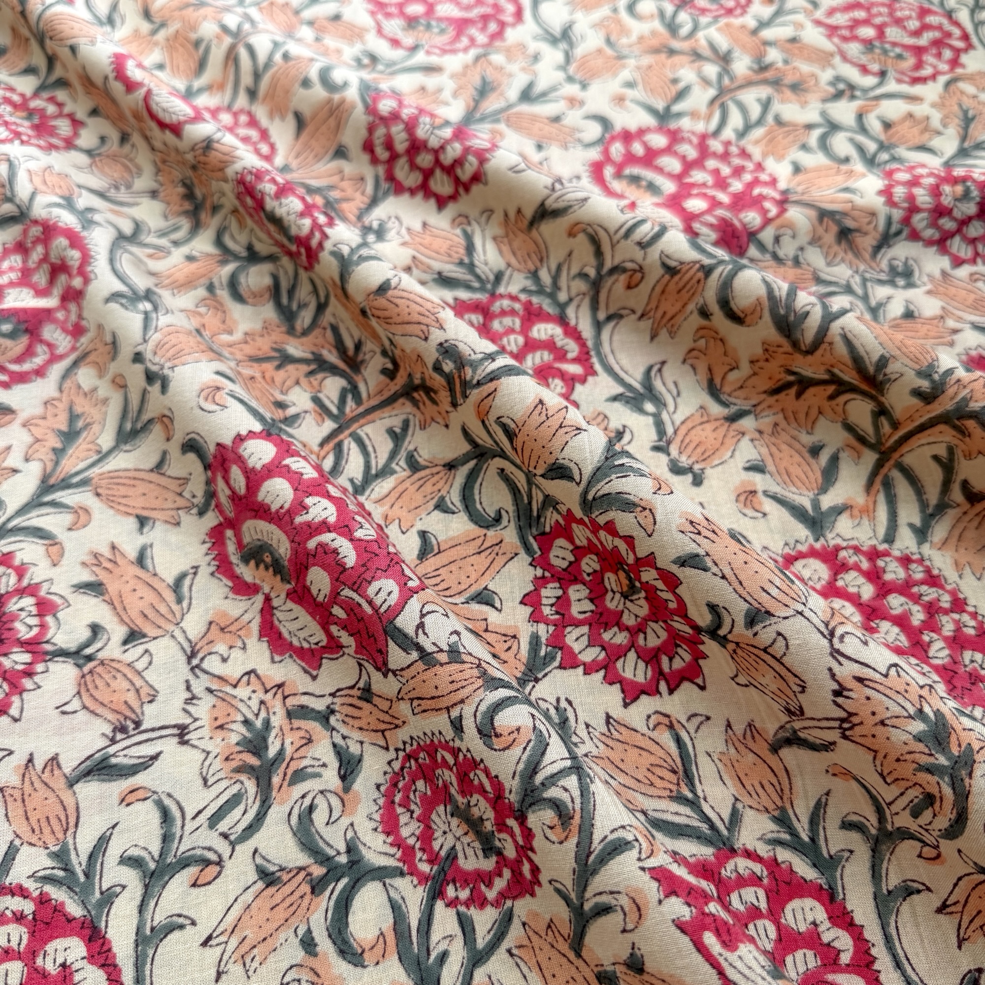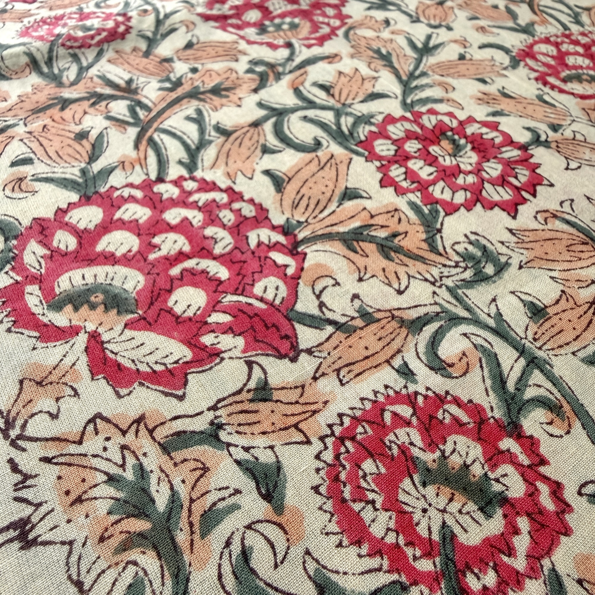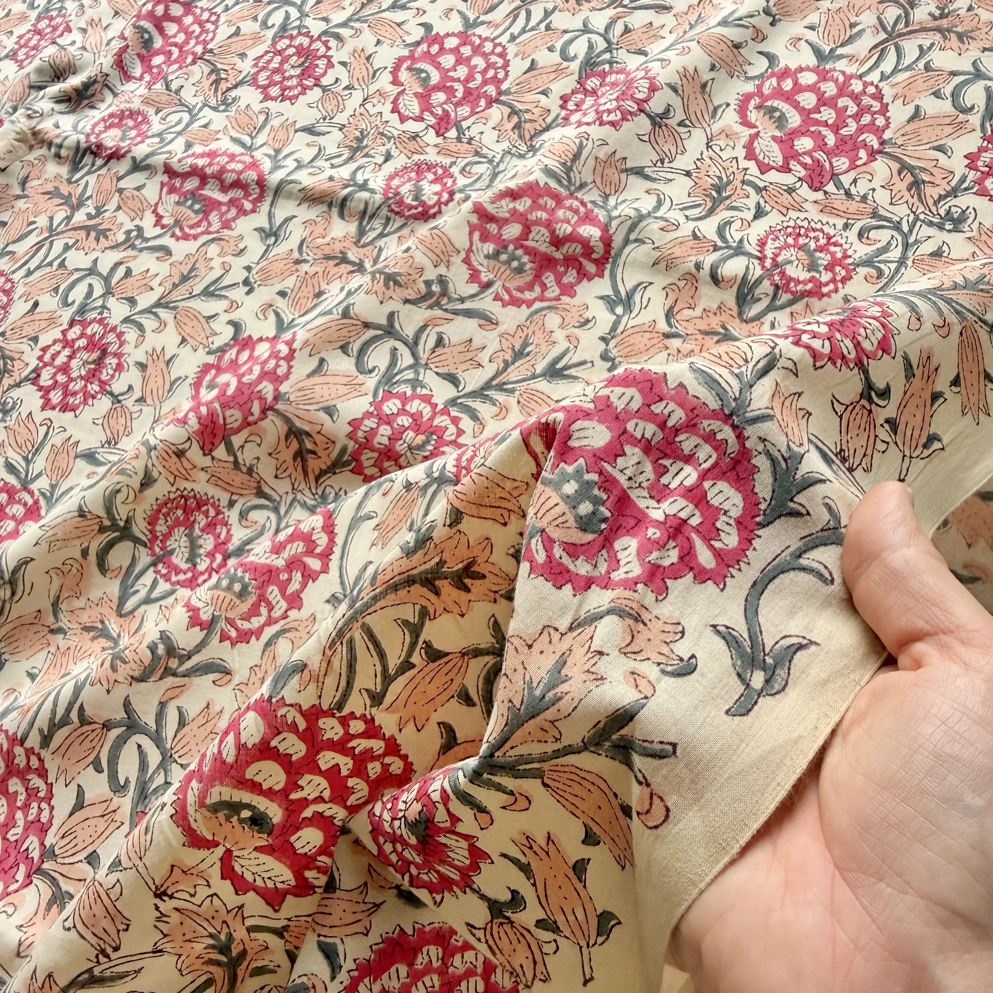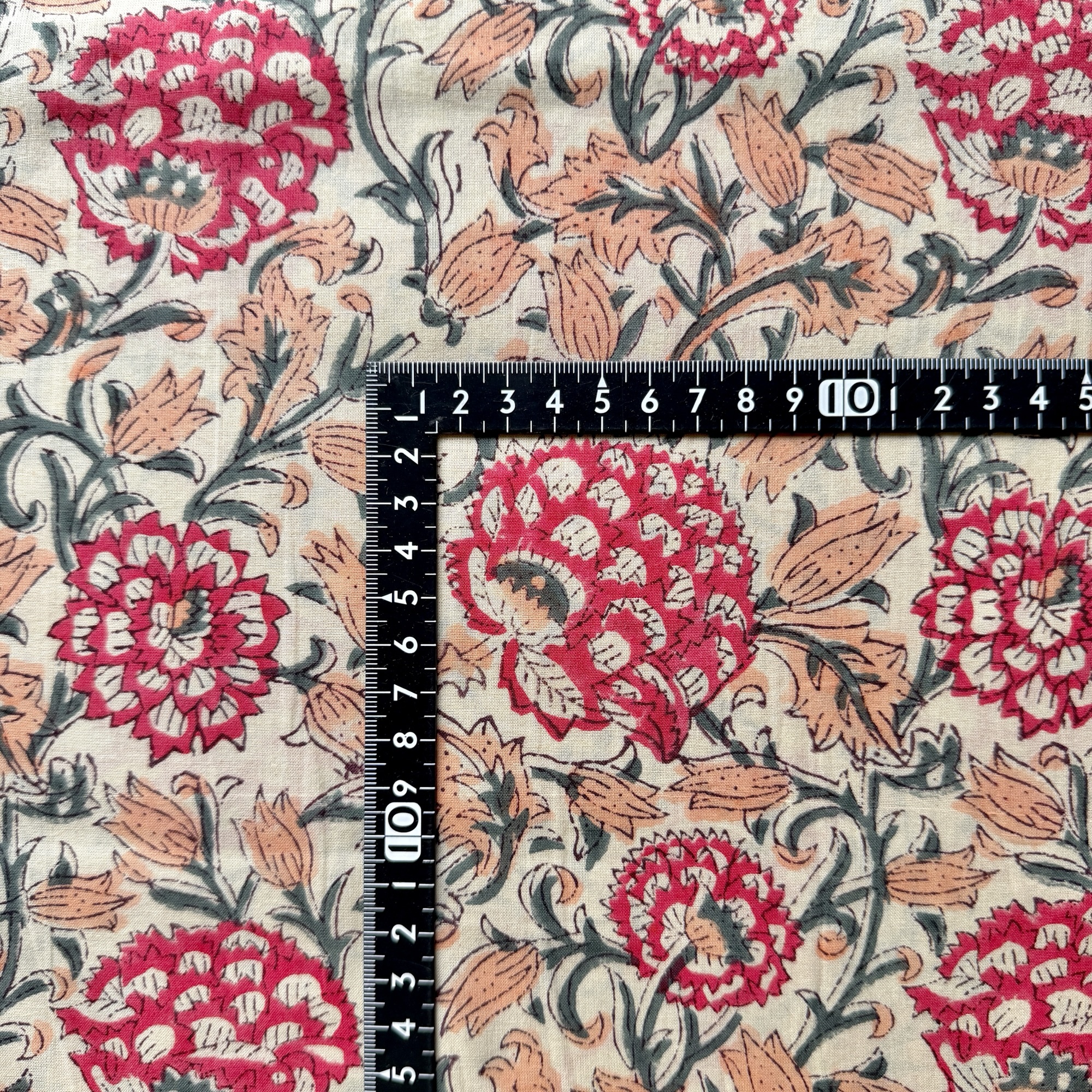 ベージュとピンクの花柄- ブロックプリント生地 No.468