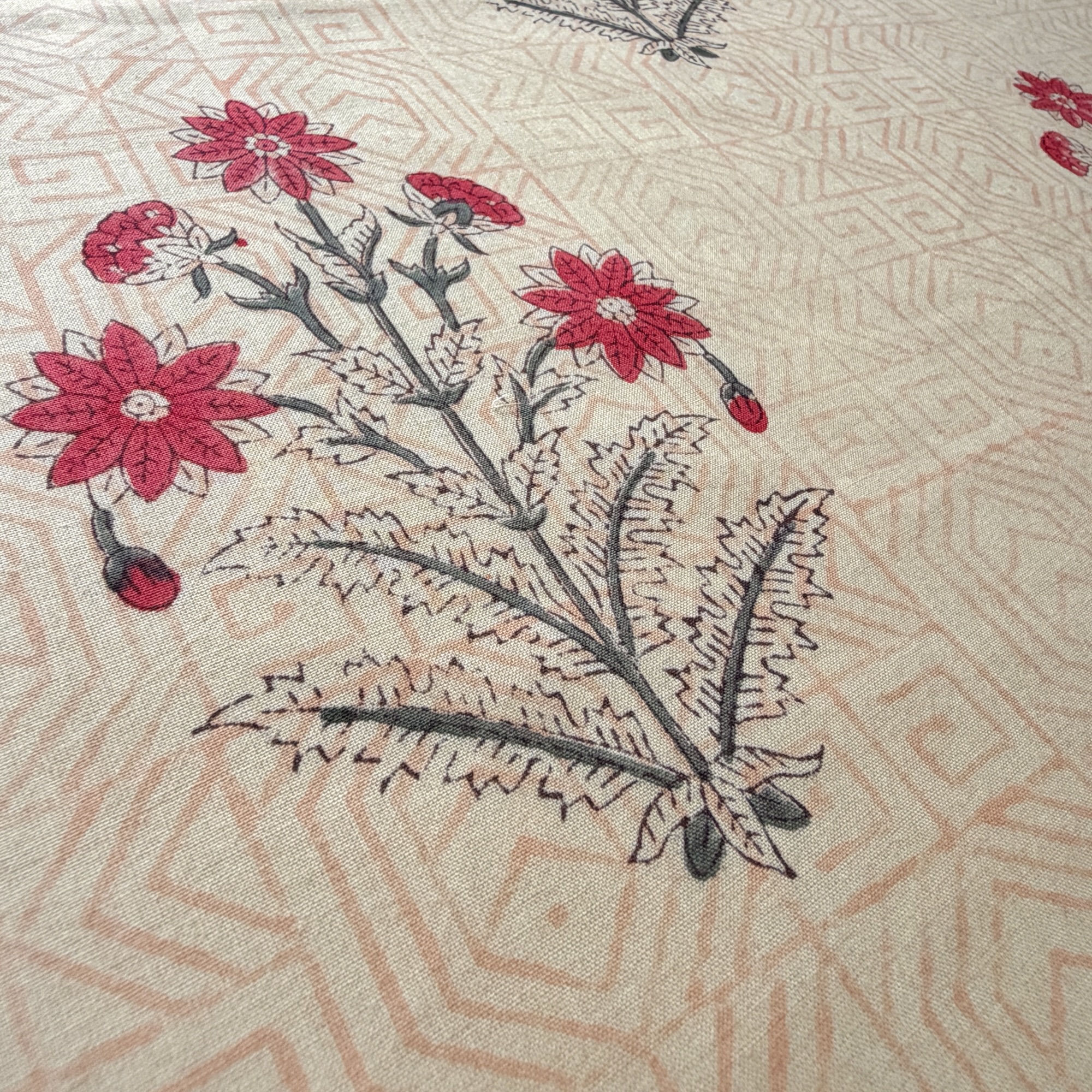 やわらかなベージュに、小さな花のモチーフがぽつぽつと並ぶデザイン。ベースには、うっすらと幾何学模様が広がり、まるで古いタイルや壁画のような雰囲気。