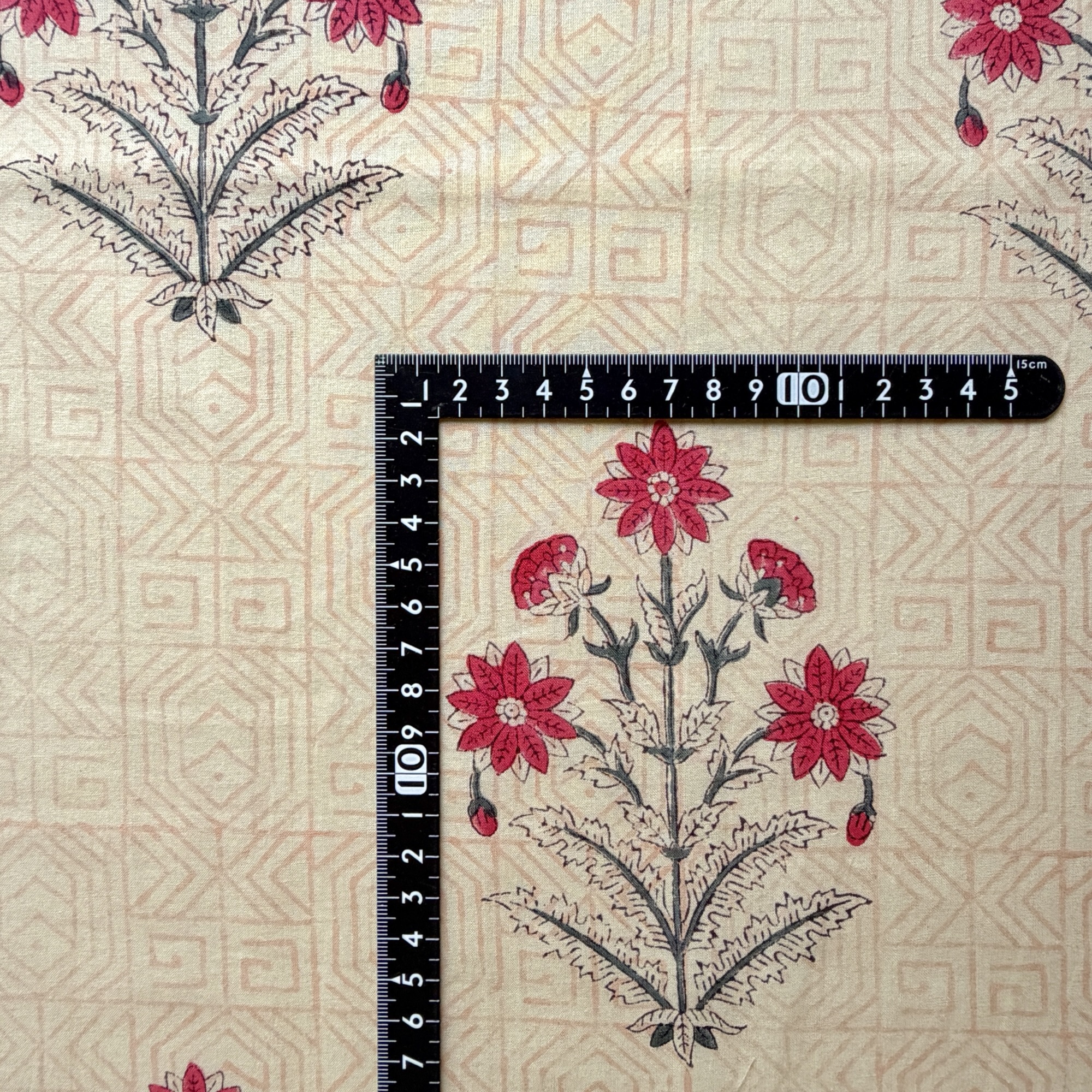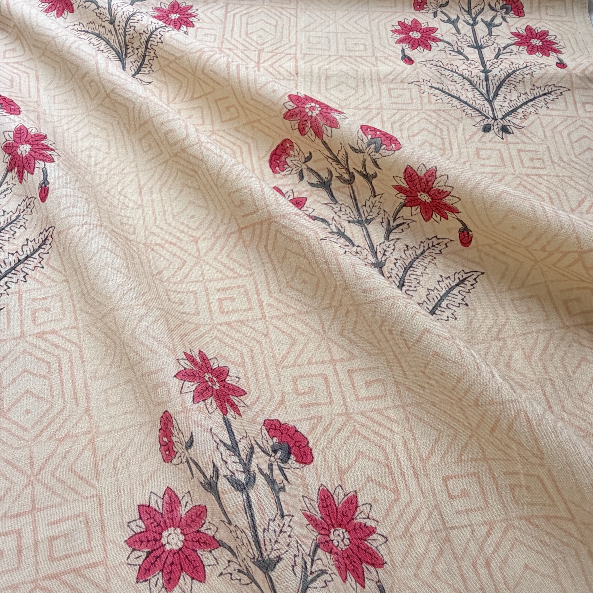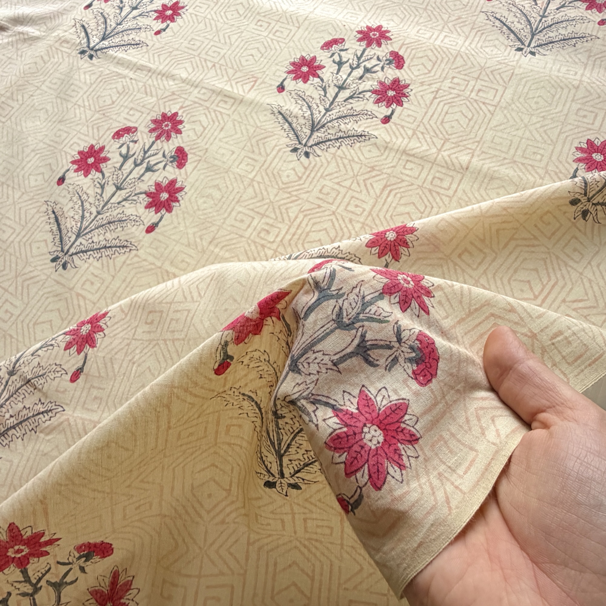 インドの職人が木版で一版ずつ染める伝統技法 ブロックプリント。手仕事ならではのゆらぎを楽しめる インド綿 の生地です。