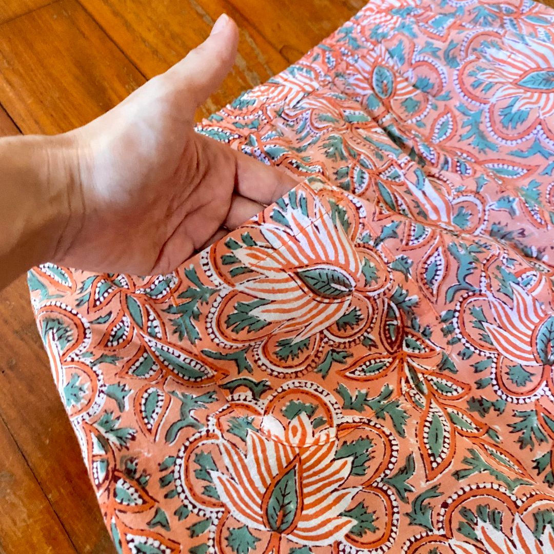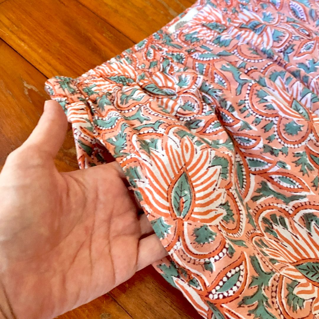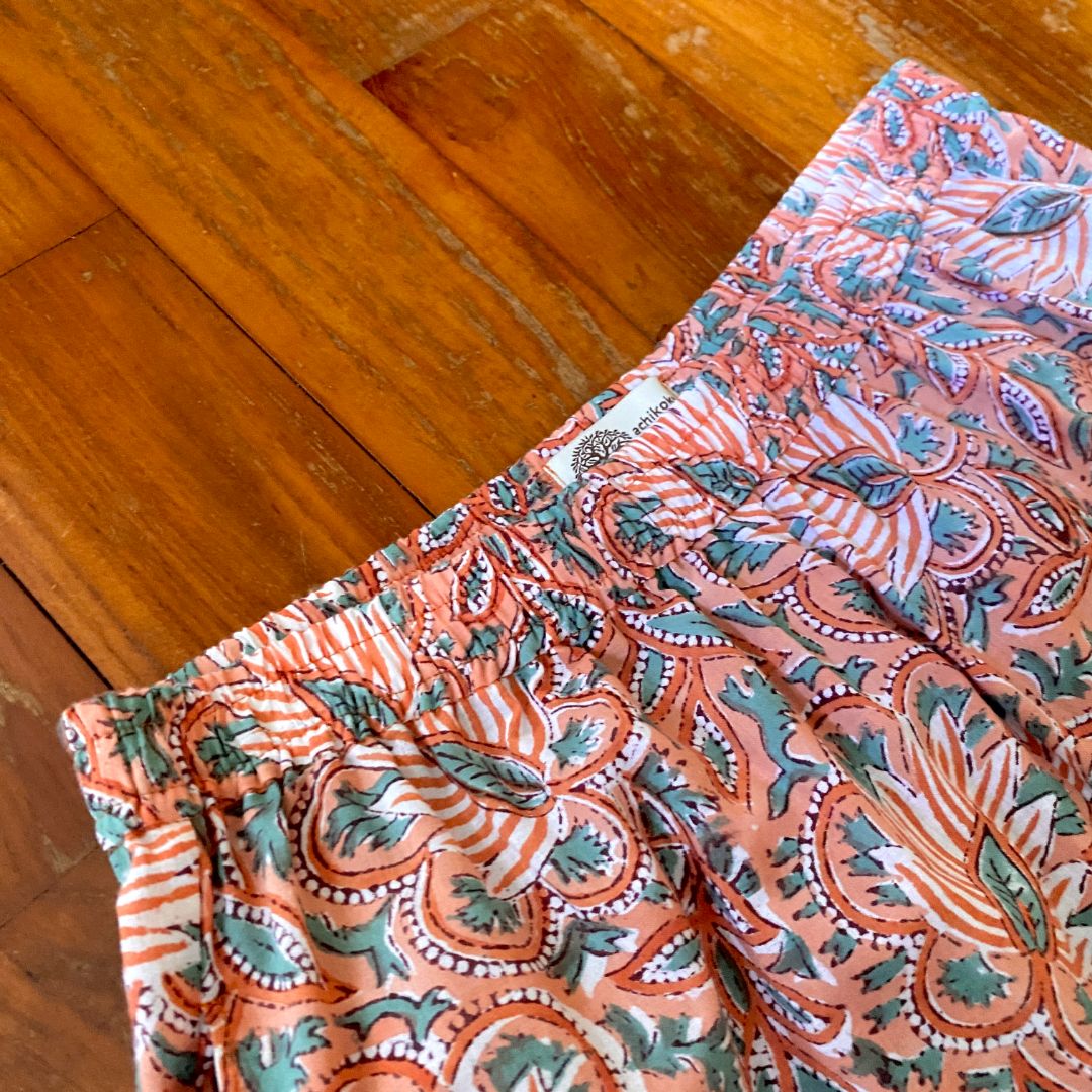 「まいにちテーパード」は、インド綿のブロックプリント生地を使って仕立てた、