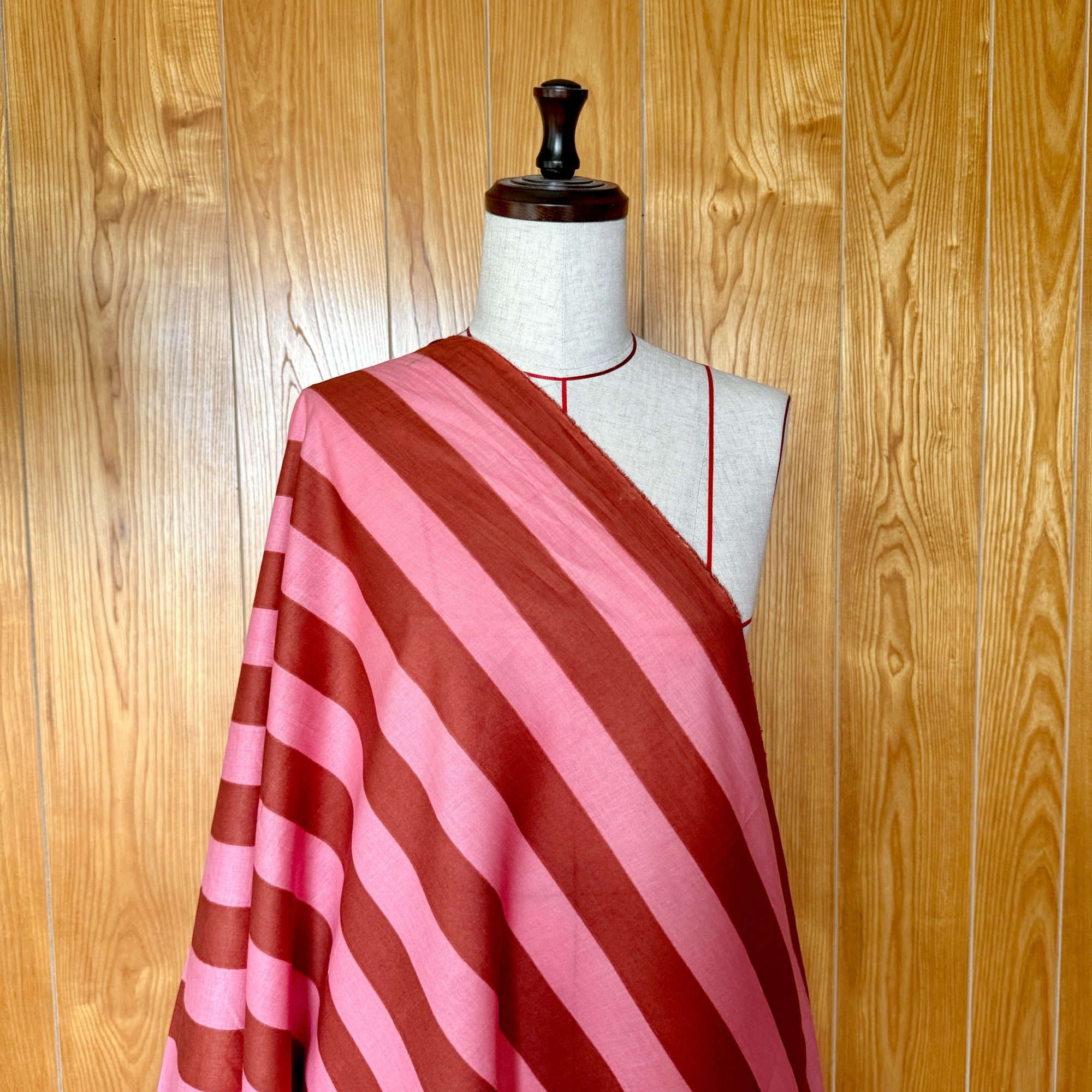 ビビッドなピンクと、チョコレートブラウン。思わず目を引く、少しポップなストライプ。どこか懐かしくて、アイスクリーム屋さんのエプロンみたいなちょっと楽しい空気をまとった配色です。