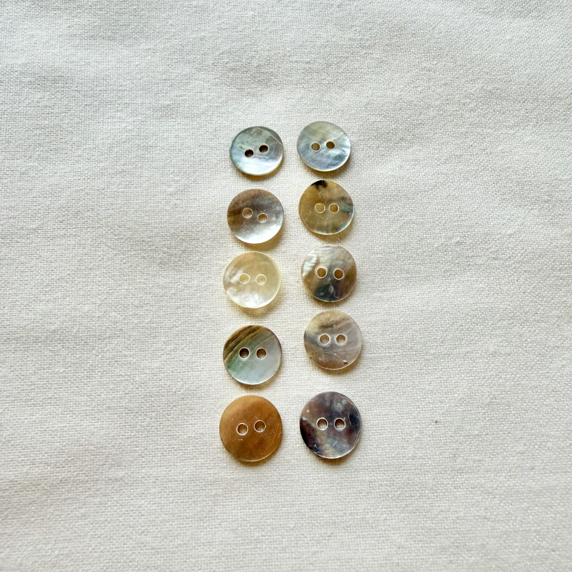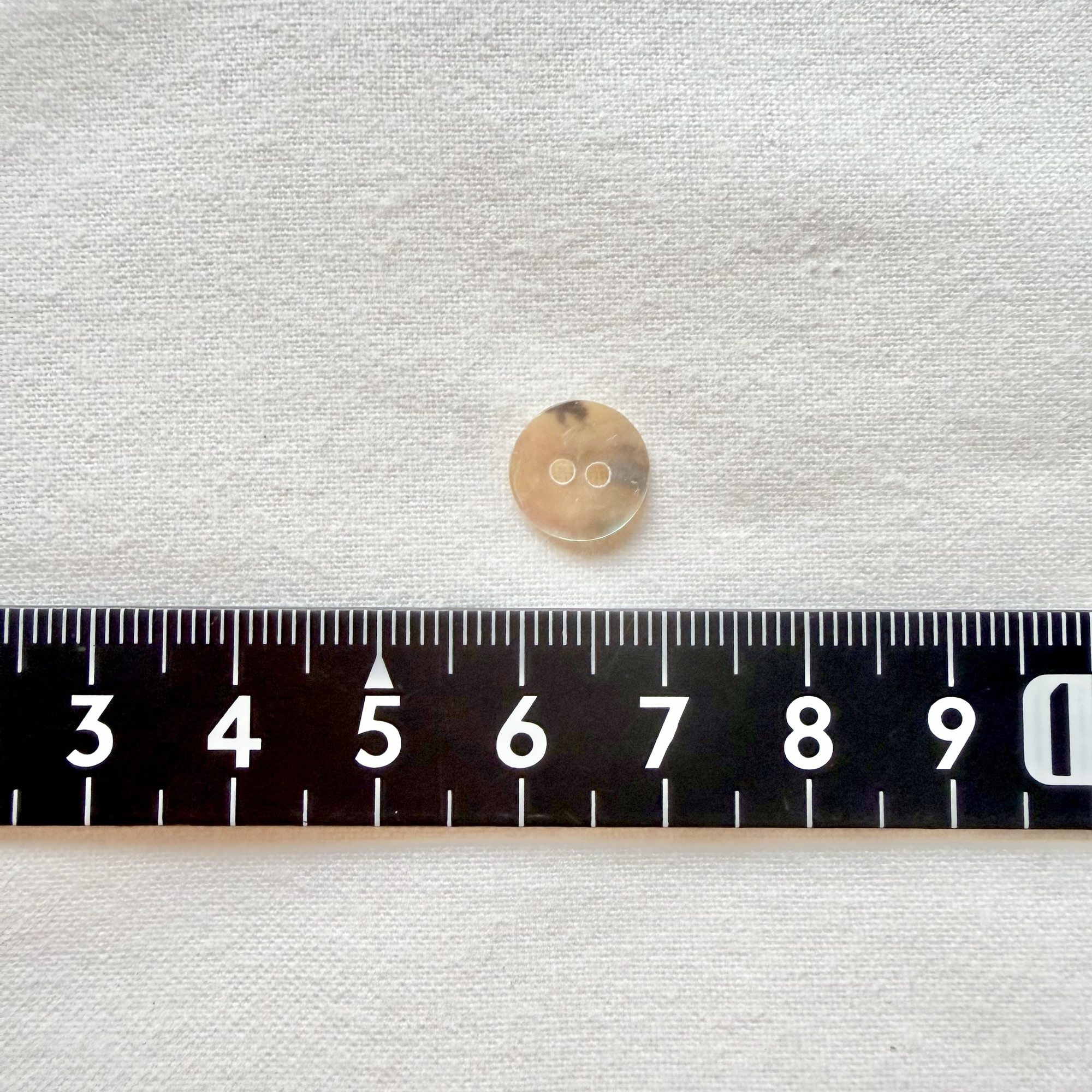 アコヤガイから削り出して作られた、ナチュラルな風合いのシェルボタン。厚みはわずか約0.5mmほど。軽やかで華奢なつくりですが、天然の光沢が上品に輝きます。