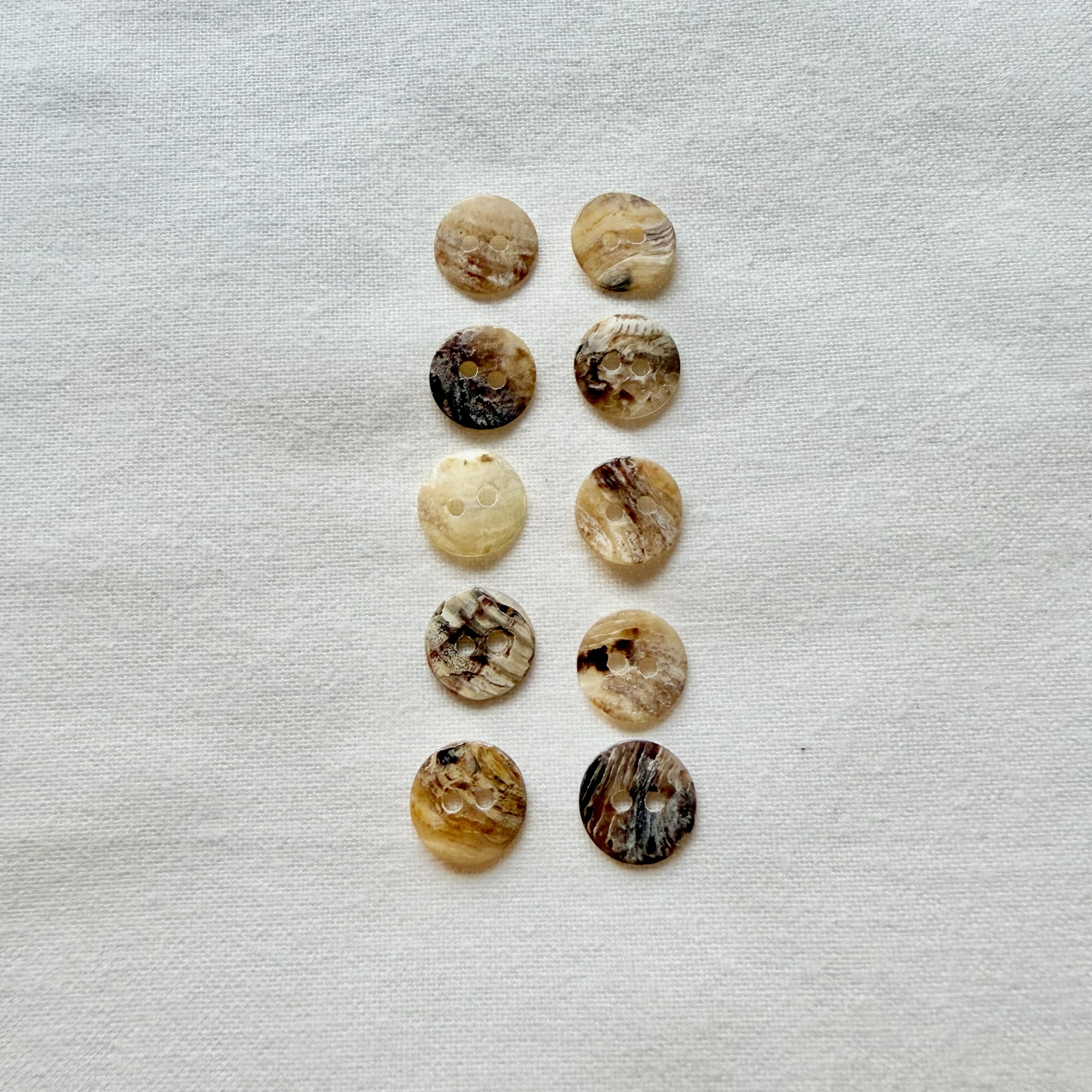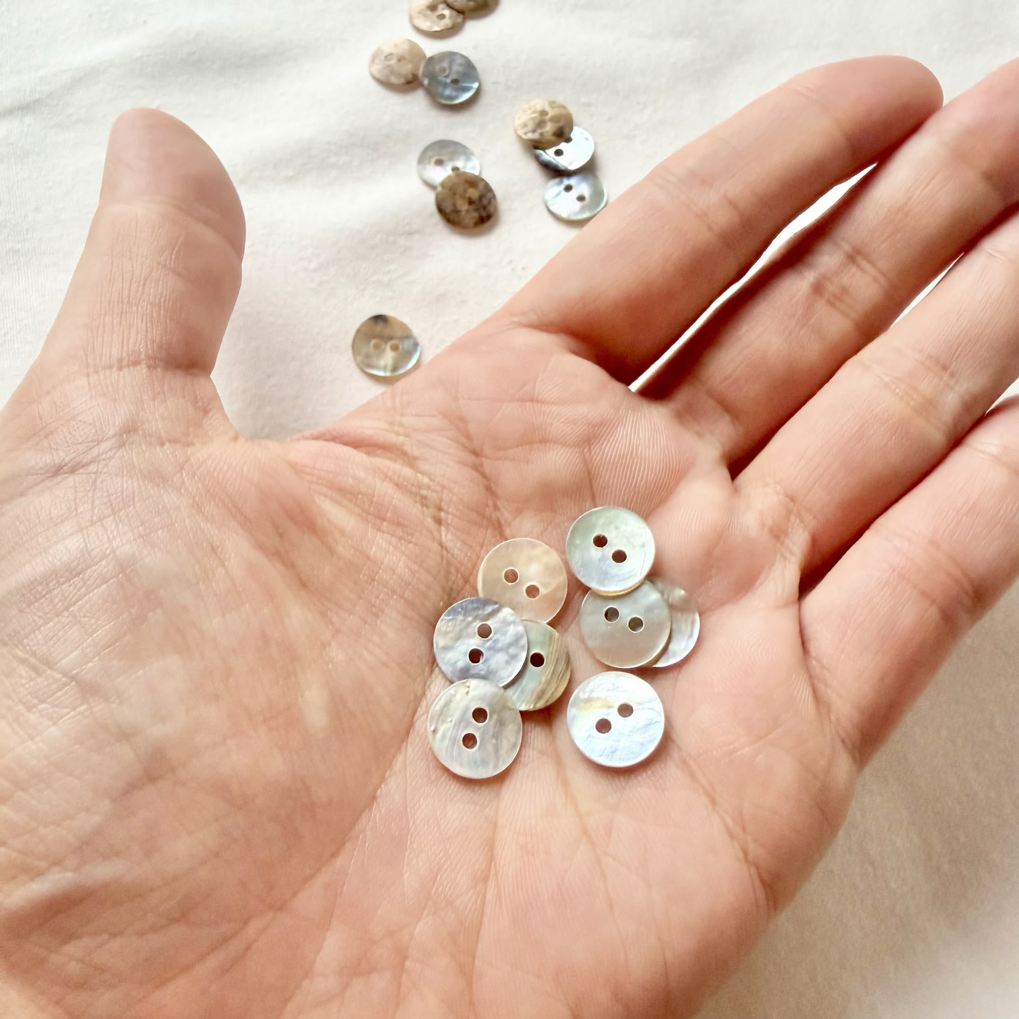 一つひとつに個性があり、かたちや色味にわずかな歪みやムラがあるのも魅力のひとつ。裏面には貝殻の質感がそのまま残り、「本物の貝から作られている」 ことを感じられるやさしい手触りです。どんな作品にも自然になじむ、素朴で美しいパーツです。どんな素材にも溶け込む自然な輝きで、ブロックプリントやインド綿の服にそっと“手仕事の余白”を添えてくれます。
